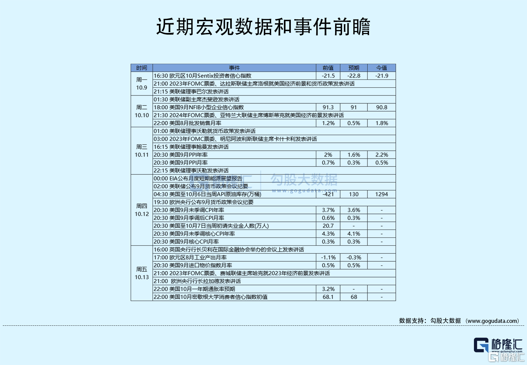 美联储-鲍曼:通胀问题可能使美联储需要进一步加息并维持一段时间、沃勒:将观察长期利率上升如何影响货币政策,金融收紧会替美联储做一些事、博斯蒂克重申不用再加息、柯林斯:官员们正采取耐心的态度,但根据即将发布的数据,可能需进一步加息。将考虑中东地区的动荡局势。9月会议纪要:总体认为通胀面临上行风险,货币政策风险更偏双向,所有与会者均同意将高利率维持一段时间、一致认为可以谨慎行事。