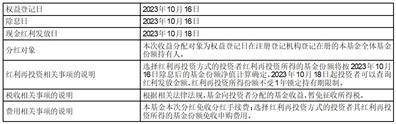 (2)本基金收益分配方式分两种:现金分红与红利再投资,投资人可选择现金红利或将现金红利按除权日的基金份额净值自动进行再投资;若投资人不选择,本基金默认的收益分配方式是现金分红,本次分红确认的方式将按照投资者在权益登记日前(不含2023年10月16日)最后一次选择的分红方式为准。如投资者在多家销售机构购买了本基金,其在任一家销售机构所做的基金份额的分红方式变更,只适用于该销售机构指定交易账户下托管的基金份额,投资者可登陆本公司官网查询本基金销售机构。