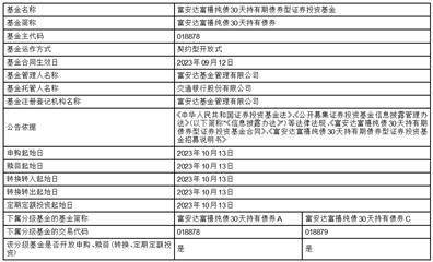 本公告仅对本基金开放日常申购、赎回、转换和定期定额投资的有关事项予以说明。投资者欲了解本基金的详细情况,请仔细阅读2023年8月15日刊登在《证券时报》上的《富安达富禧纯债 30 天持有期债券型证券投资基金招募说明书》和《富安达富禧纯债 30 天持有期债券型证券投资基金招募说明书基金合同》等资料。相关法定披露文件,投资者还可以登录本基金管理人网站(www.fadfunds.com)进行查阅。投资者亦可拨打本基金管理人的全国统一客户服务电话4006306999(免长途话费)垂询相关事宜。