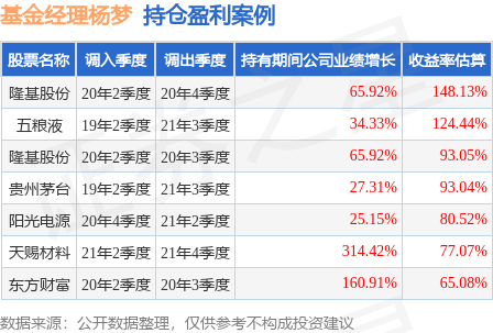 杨梦管理的博道久航混合A基金在20年2季度买入隆基股份,在持有1个季度后在20年3季度卖出。持有期间的估算收益率为93.05%,持有期间隆基股份在2019年到2020年的年报营业总收入增幅达65.92%。