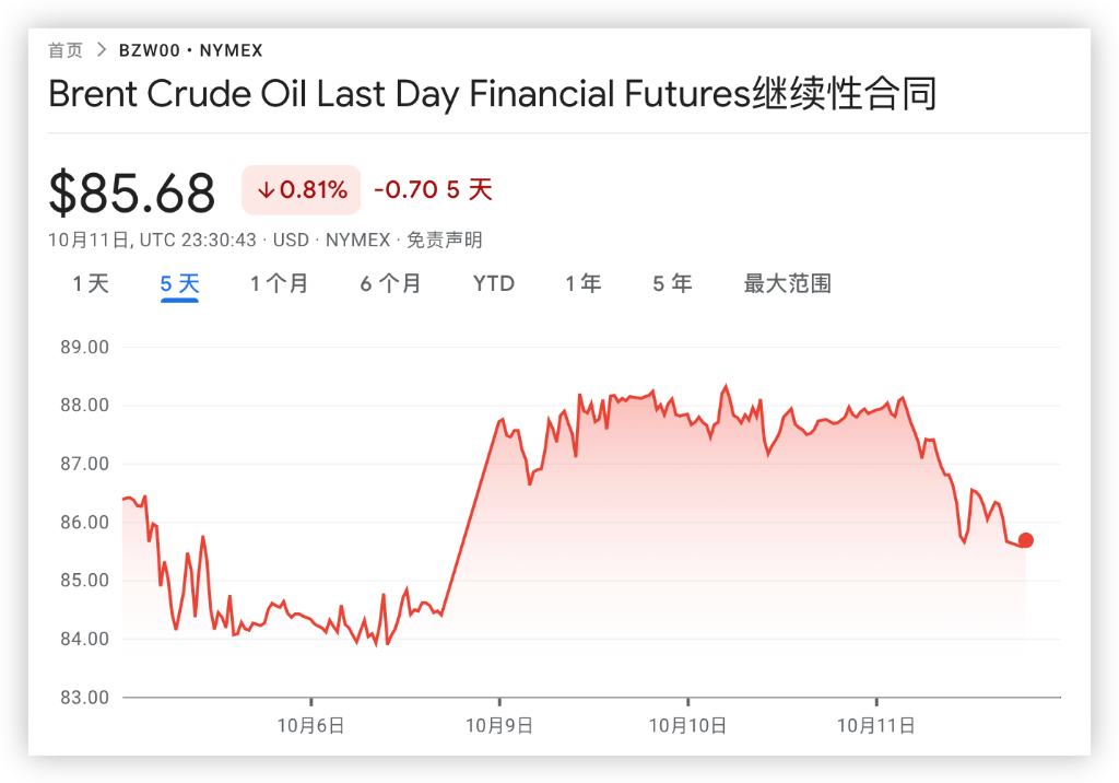 激烈的巴以冲突令市场普遍担忧原油供应可能因战事而受影响,国际油价本周一度跳涨至逼近90美元。不过,随着OPEC老大沙特早前发话称将维护石油市场稳定,布油隔夜跌超2%至85美元附近,抹去几乎全部“战争涨幅”。
