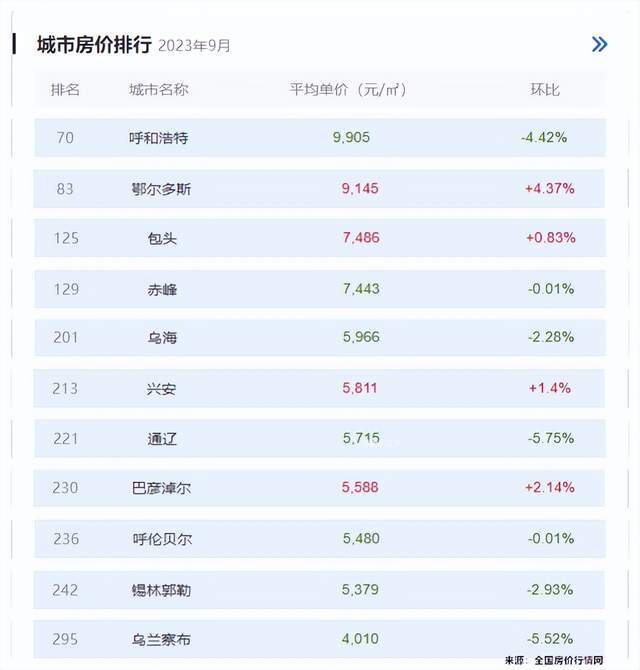 10月10日,中国房价行情网发布9月内蒙古各盟市房价,除阿拉善盟外,房价上涨有4个盟市,分别是鄂尔多斯、包头、兴安和巴彦淖尔。房价下降的有7个盟市,分别是呼和浩特、赤峰、乌海、通辽、呼伦贝尔、锡林浩特、乌兰察布。