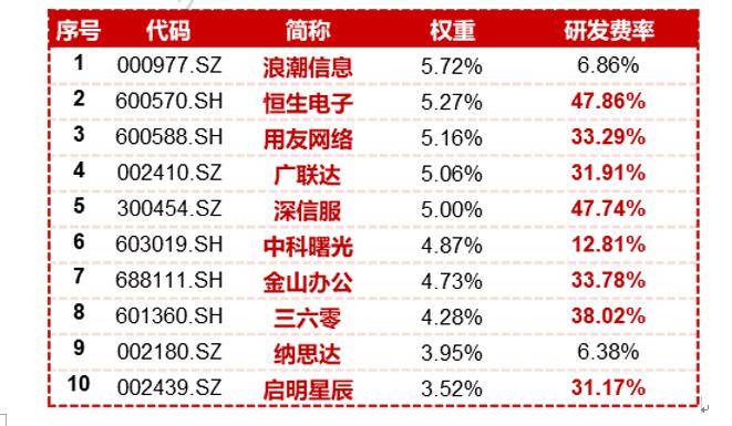 中证信创指数覆盖基础硬件、基础软件、应用软件、信息安全、外部设备等信创产业链核心环节。前十大权重股多为高研发投入的信创龙头股,研发费率均数达29%,权重占比合计达47.56%。