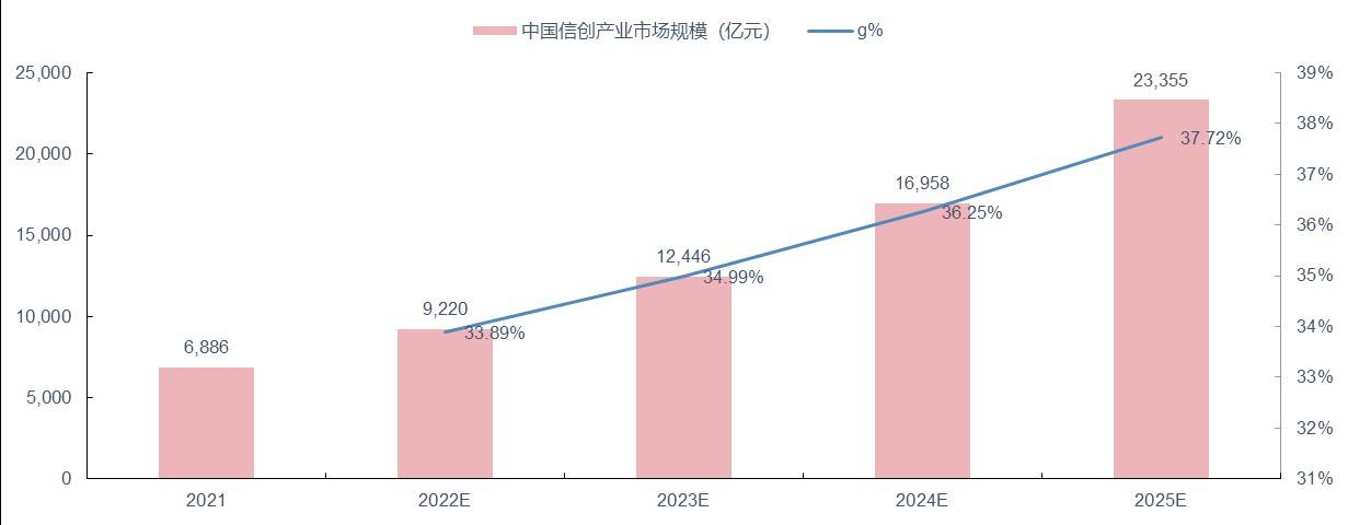 随着经济高质量发展转型及数字化推进,市场对基础信息计算产业的发展需求也不断增长,建设安全可靠的信息技术底层架构和开放丰富的生态是我国经济健康发展的关键。据海比研究院统计,2021年中国信创产业市场规模为6886.3亿元,预计到2025年将突破2万亿,达到23354.6亿元,年复合增长率达35.7%。