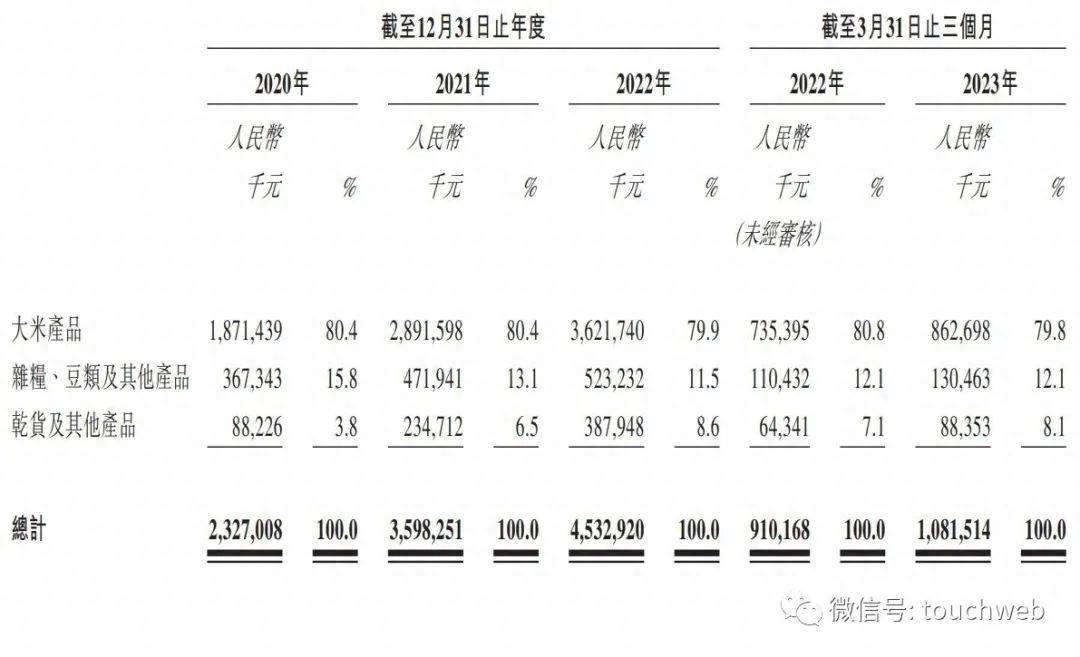 其中,十月稻田2023年第一季度来自大米产品的营收为8.63亿元,占营收比例的79.8%,毛利率为15.1%;来自杂粮、豆类及其他产品营收为1.3亿元,占比为12.1%,毛利率为26.4%;来自干货及其他产品的营收为8835万元,占比为8.1%,毛利率为12%。
