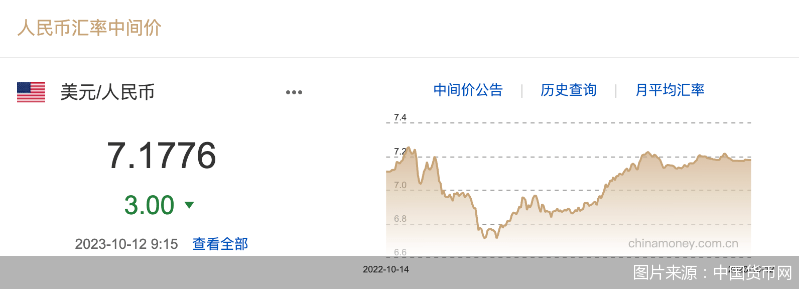 北京商报讯(记者 廖蒙)10月12日,人民银行授权中国外汇交易中心公布,2023年10月12日银行间外汇市场人民币汇率中间价为:1美元对人民币7.1776元,前一交易日中间价报7.1779元,单日调升3基点。人民币中间价连续四个交易日小幅升值。