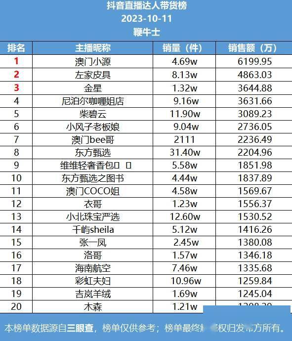 10月11日,抖音直播达人带货榜一是澳门小源,销售额6199.95万;榜二左家皮具,销售额4863.03万;榜三金星,销售额3644.88万。