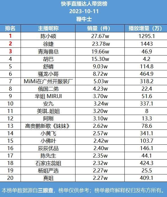【直播带货日榜】是鞭牛士和三言科技推出的多个平台达人每日直播带货榜单。根据第三方数据平台“三眼查”提供的数据,鞭牛士将对快手、抖音平台的达人带货交易量、GMV、播放量进行统计和分析,以供各位从业者参考。