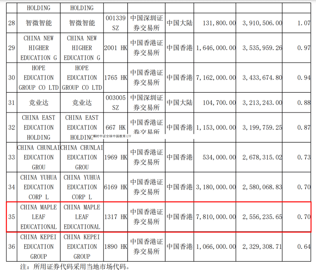 据教育ETF的2023年中报显示,其仍持有枫叶教育781万股,持仓市值255.62万元,占净值比例为0.7%,市值排名第35位。枫叶教育虽然早早被中证全球中国教育主题指数剔除,但是由于其一直处于停牌状态,教育ETF无法将其从投资组合中剔除出去。