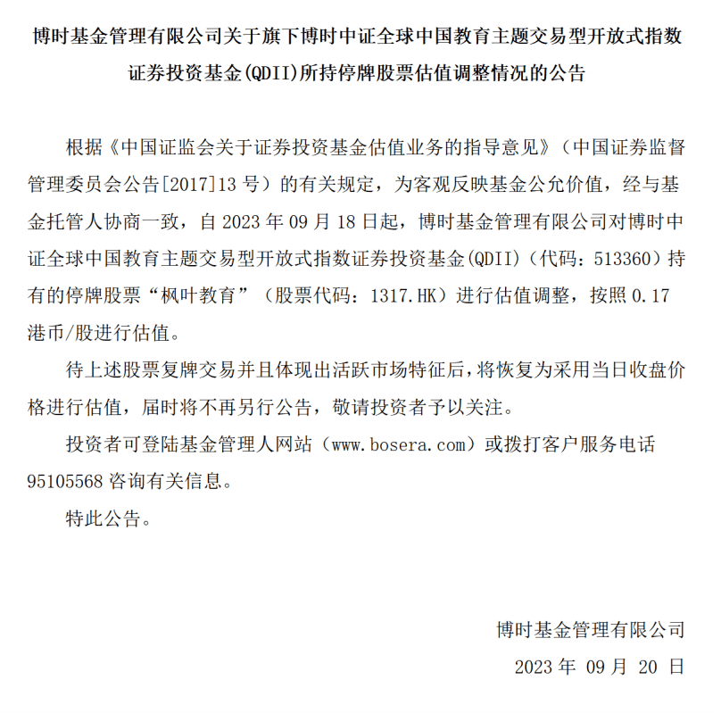 如此情形似乎也让资方意识到了风险。9月20日,博时中证全球中国教育ETF(下称“教育ETF”,SH:513360)公告称,为客观反映基金公允价值,经与基金托管人协商一致,自2023年9月18日起对持有的停牌股票“枫叶教育”进行估值调整,按照0.17港元/股进行估值。