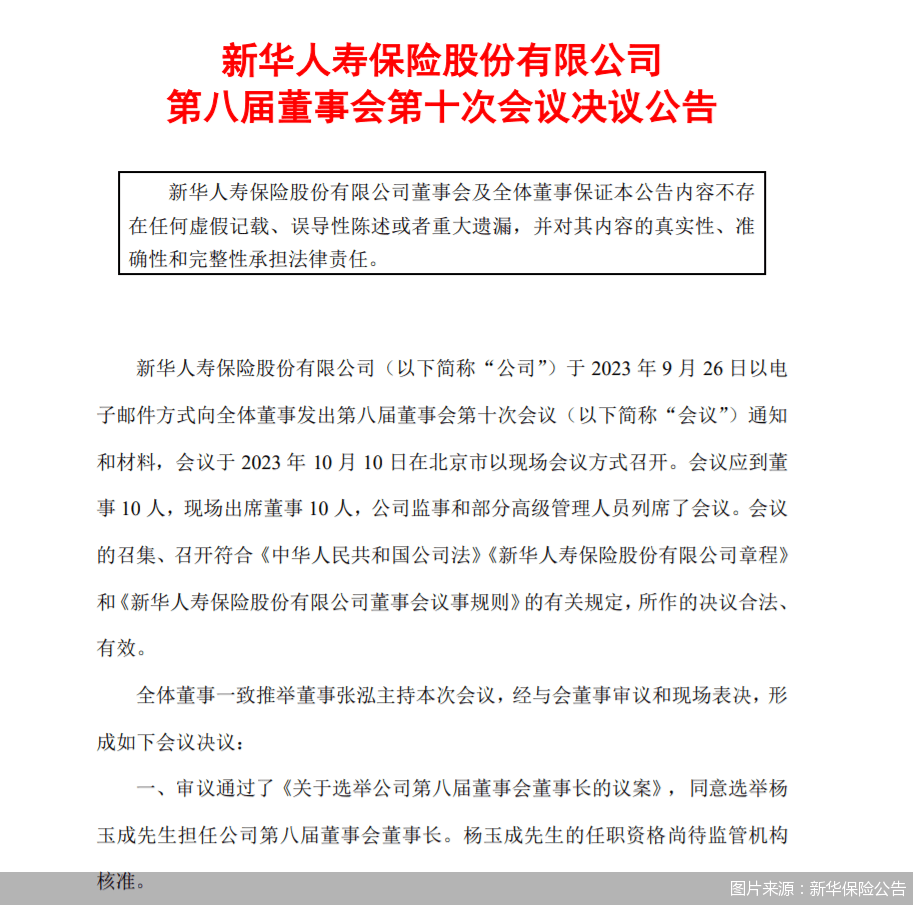 北京商报讯(记者 李秀梅)10月10日,新华人寿保险股份有限公司(以下简称“新华保险”)公告称,公司董事会审议通过了《关于选举公司第八届董事会董事长的议案》,同意选举杨玉成担任新华保险第八届董事会董事长。杨玉成的任职资格尚待监管机构核准。