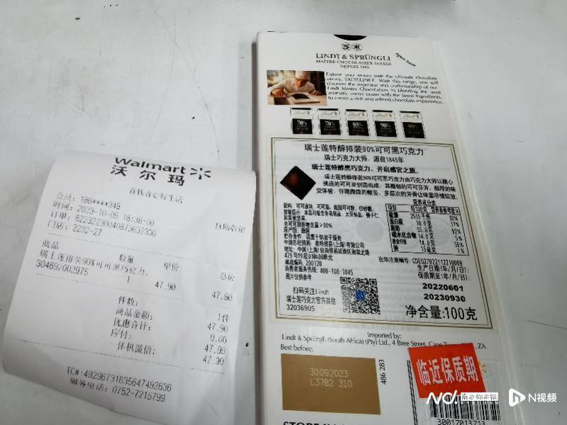 万女士投诉称,10月6日下午,她带娃来到位于惠州市惠城区江北意生广场的沃尔玛超市购物,看到临期货架上的巧克力打折,就花47.9元购买了一份瑞士莲特醇排装黑巧克力,买完单才发现巧克力已经过了保质期,便马上掉头去服务台找商家。