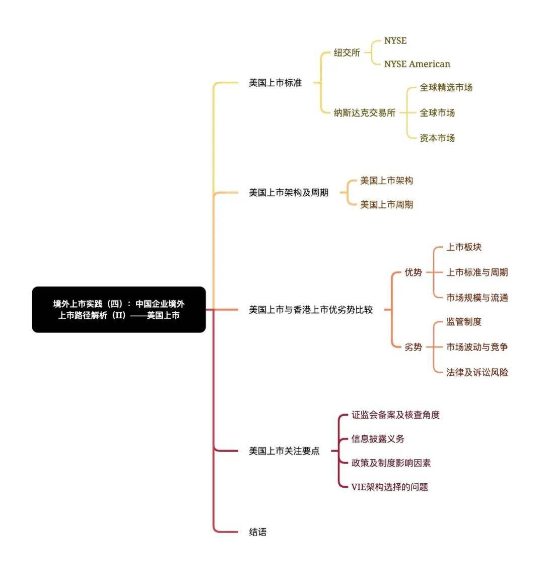 在此前的《境外上市实践(二):中国企业境外上市路径解析(I)》(香港上市)中,我们已对境内企业香港上市的标准、架构、周期、优劣比较以及关注要点方面进行了解析。本文作为境外上市路径解析系列文章的第二篇,将立足当下背景,从境内企业美国上市的标准、架构及周期、优劣势以及关注要点等方面对美国上市的路径进行解析。