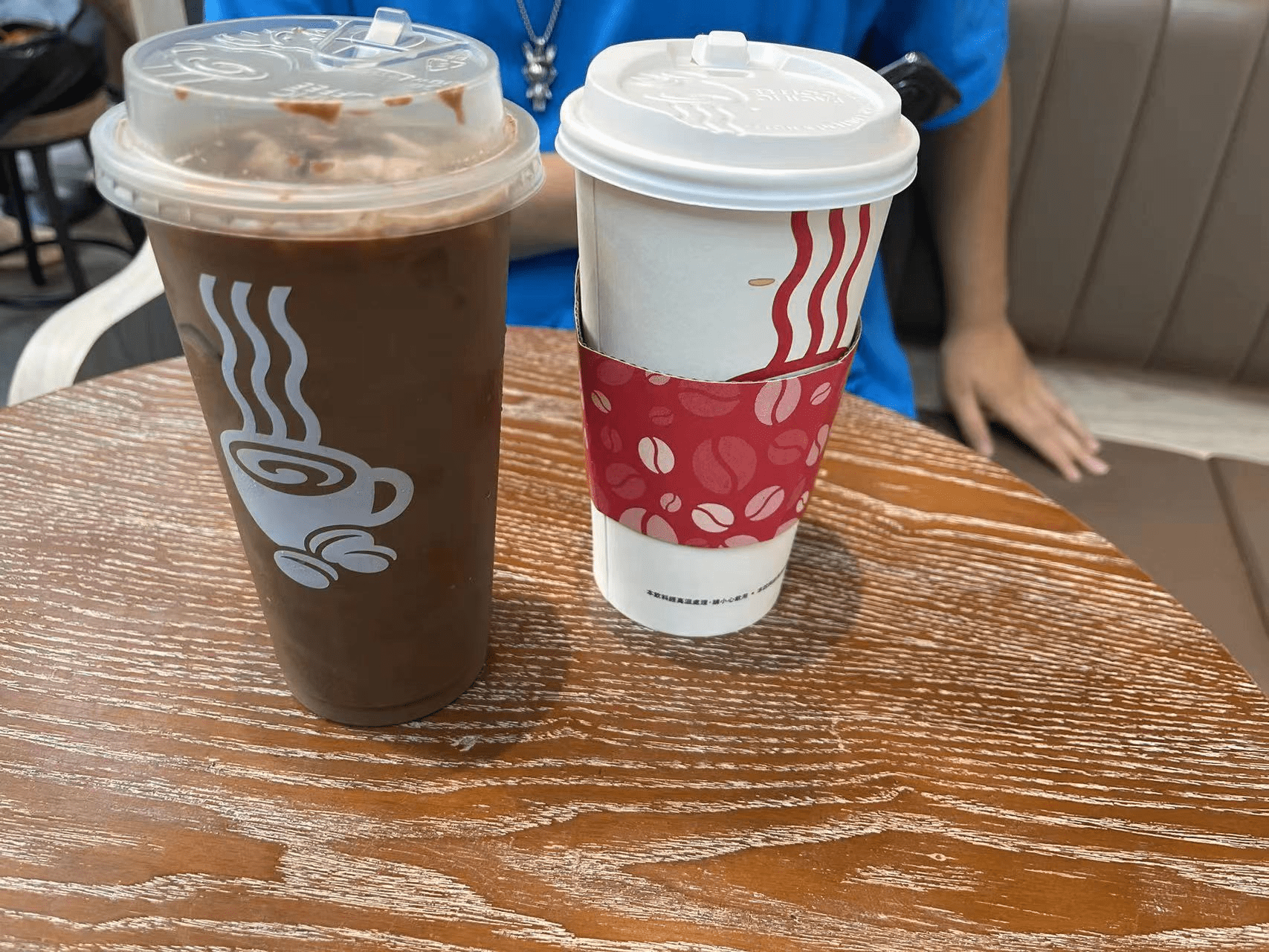 行走在铜锣湾的街头,可能寻找其他店铺会有些困难,但街头永远不缺咖啡店。 当我从酒店出来与同伴商量想去喝杯咖啡,结果刚刚走出街角,太平洋咖啡就在眼前。 走进咖啡店里,我们点了一杯鲜奶咖啡和冰可可,在太平洋咖啡,店内饮品的价格一般在27-47港元之间,可以根据喜好选择大中小的杯子。 除了咖啡以外门店,还有其乐冰以及茶饮等饮品。