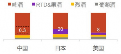 中日美三国低度酒市场规模占比