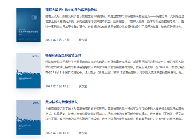 在官网上,罗汉堂列出了出版的3篇报告,包括《理解大数据:数字时代的数据和隐私》、《数字技术与普惠性增长》等,还有1本书籍《新普惠经济》。