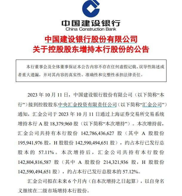 建设银行公告,汇金公司于2023年10月11日通过上海证券交易所交易系统增持本行A股1838.00万股。本次增持前,汇金公司共持有本行股份1427.86亿股(其中A股股份1.96亿股,H股股份1425.90亿股),约占本行已发行总股本的57.11%。本次增持后,汇金公司共持有本行股份1428.05亿股(其中A股股份2.14亿股,H股股份1425.90亿股),约占本行已发行总股本的57.12%。