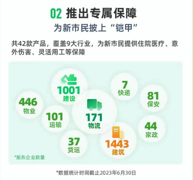 自成立以来,众安保险持续响应国家加强新市民金融服务工作的号召,坚持以普惠为导向,提供一揽子灵活的普惠保障方案助推新经济、新业态繁荣发展。截至2023年6月30日,共推出新市民服务相关保险产品42款,覆盖物流、建筑、建设、运输、物业、货运、保安、家政、快递等9大行业企业。