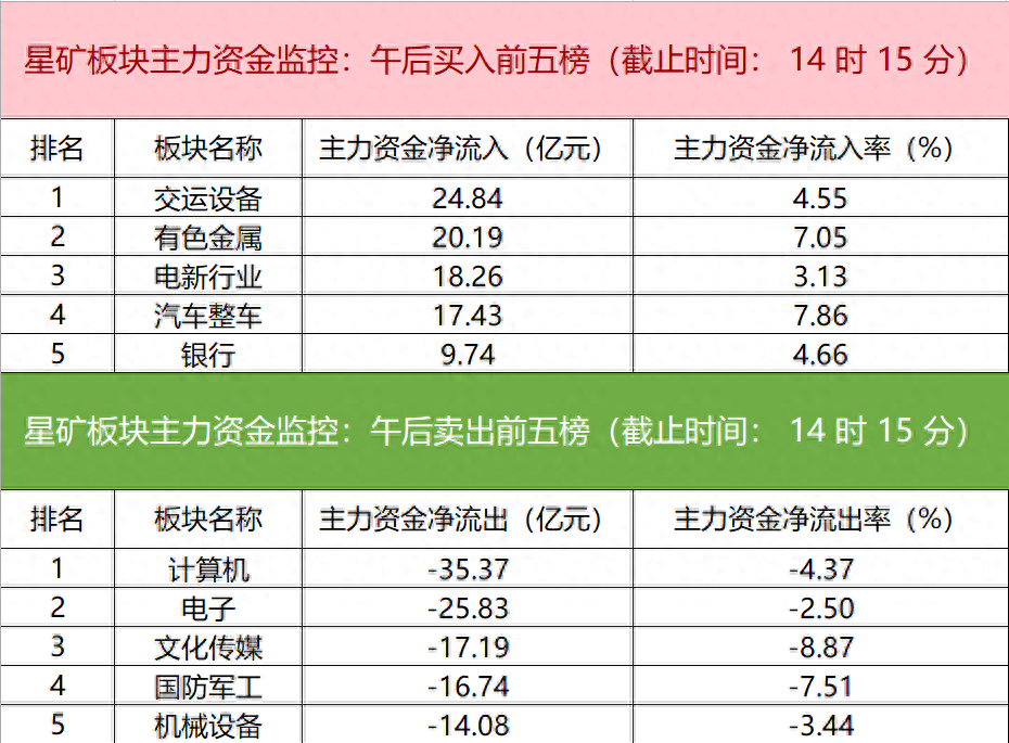 【主力资金监控:计算机板块净流出超35亿元】财联社10月12日电,财联社星矿数据显示,今日主力资金净流入交运设备、有色金属、电新行业等板块,净流出计算机、电子、文化传媒等板块,其中计算机板块净流出35.37亿元。个股方面,长安汽车大涨,主力资金净买入8.66亿元,四川长虹、比亚迪、中公教育获主力资金净流入居前;华力创通遭净卖出超8亿元,浪潮信息、张江高科、常山北明等主力资金净流出额居前。