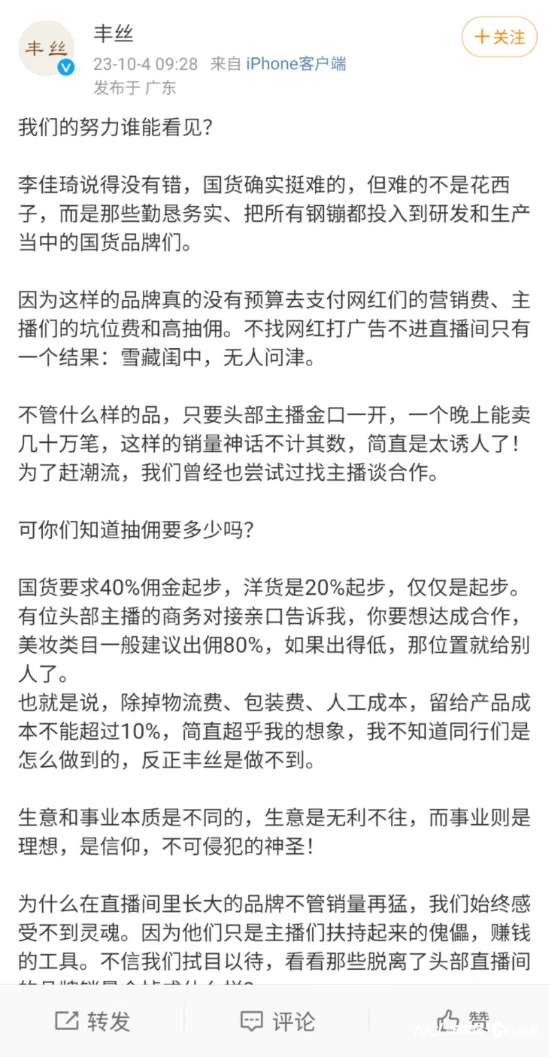 此外,丰丝还在其微博爆料,直播电商行业内,“国货要求40%佣金起步,洋货是20%起步,仅仅是起步。”品牌方如果想要跟大主播合作,还要签一份《最低价协议》。