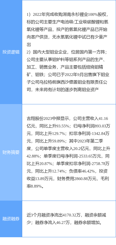 该股为锂电池,有色金属,有色 · 钼概念热股,当日锂电池概念上涨2.8%,有色金属概念上涨2.13%,有色 · 钼概念上涨2.0%。