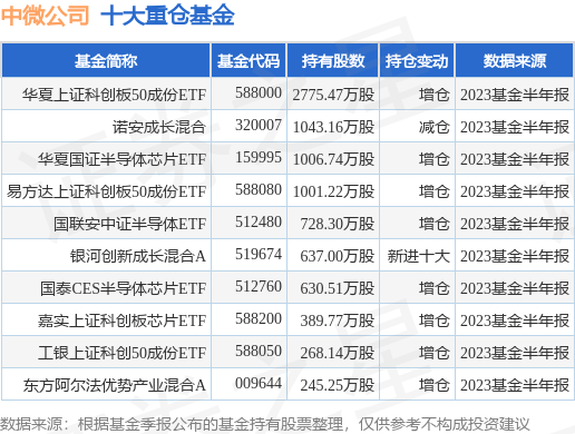 根据2023基金半年报公募基金重仓股数据,重仓该股的公募基金共1111家,其中持有数量最多的公募基金为华夏上证科创板50成份ETF。华夏上证科创板50成份ETF目前规模为671.92亿元,最新净值0.9375(10月11日),较上一交易日上涨1.4%,近一年上涨0.47%。该公募基金现任基金经理为张弘弢 荣膺。张弘弢在任的基金产品包括:华夏沪深300ETF联接A,管理时间为2009年7月10日至今,期间收益率为31.77%;华夏沪深300ETF,管理时间为2012年12月25日至今,期间收益率为85.68%;华夏网购精选混合A,管理时间为2016年11月2日至今,期间收益率为25.1%;华夏上证50ETF,管理时间为2016年11月18日至今,期间收益率为21.31%。荣膺在任的基金产品包括:华夏中证500ETF联接A,管理时间为2016年10月20日至今,期间收益率为-3.03%;华夏中证500ETF,管理时间为2016年10月20日至今,期间收益率为-3.05%;华夏中证央企ETF,管理时间为2018年10月19日至今,期间收益率为26.69%;华夏创业板价值ETF,管理时间为2019年6月14日至今,期间收益率为33.42%。