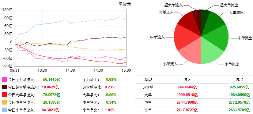 根据东财统计,截止收盘沪深两市呈现资金净流出状态,当日沪深两市资金当日沪深两市资金共流出56.14亿元。其中,超大单净流入18.86亿元,大单净流出87.57亿,中单净流出75.01亿元,小单净流入84.30亿元。