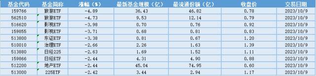 下跌方面,9日跌幅最大的是旅游ETF(159766)跌幅达到4.89%。剩余排名靠前的有旅游ETF(562510)、影视ETF(516620)、影视ETF(159855),跌幅分别为4.73%、3.98%、3.71%。从整体上看数量占比较多的为旅游ETF。