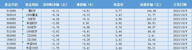 资金流出方面,9日净赎回金额最多的是酒ETF(512690),赎回金额6.31亿元。另外还有1000基金(560010)、50ETF(510050)、科创ETF(588050)赎回金额超3亿元,赎回金额分别为5.34亿元、4.26亿元、3.50亿元。其余ETF赎回金额相对较小,均未超1.3亿元。