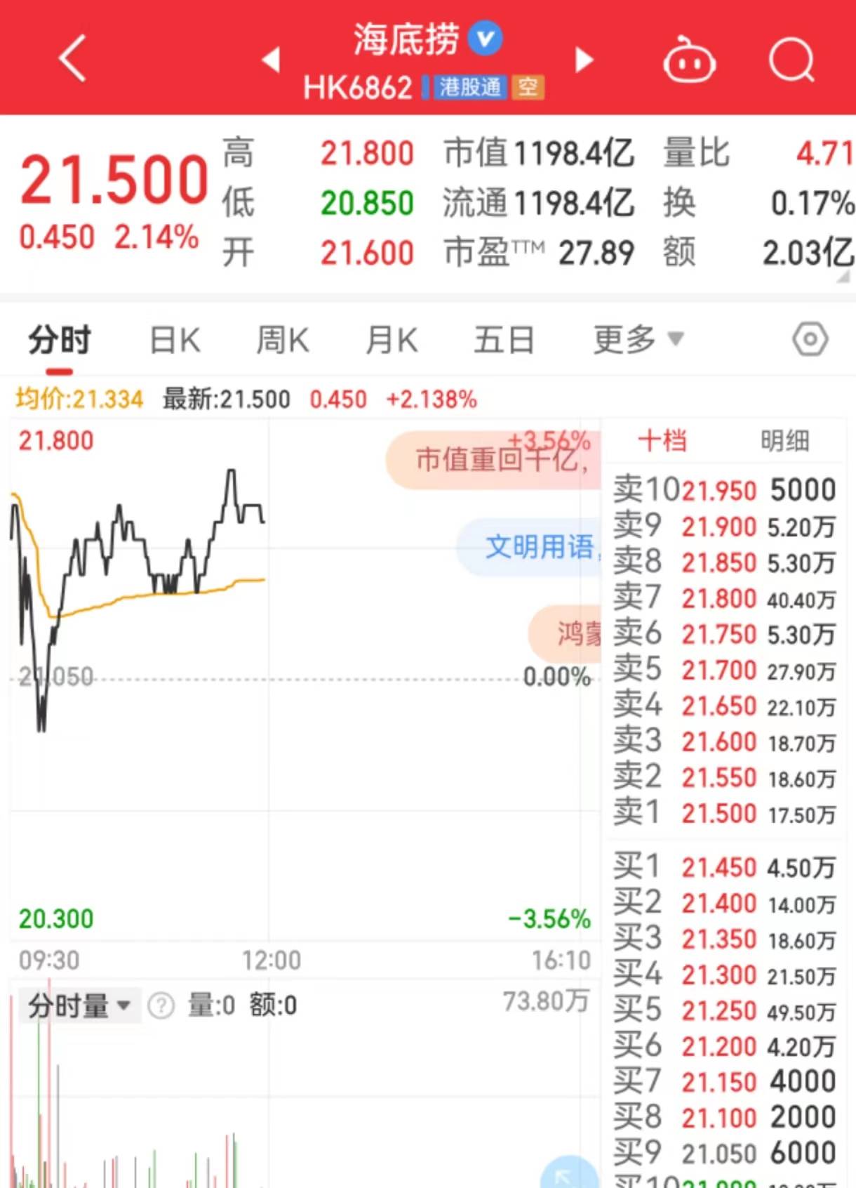 截至发稿,10月10日,海底捞股价报21.5港元,上涨2.14%。