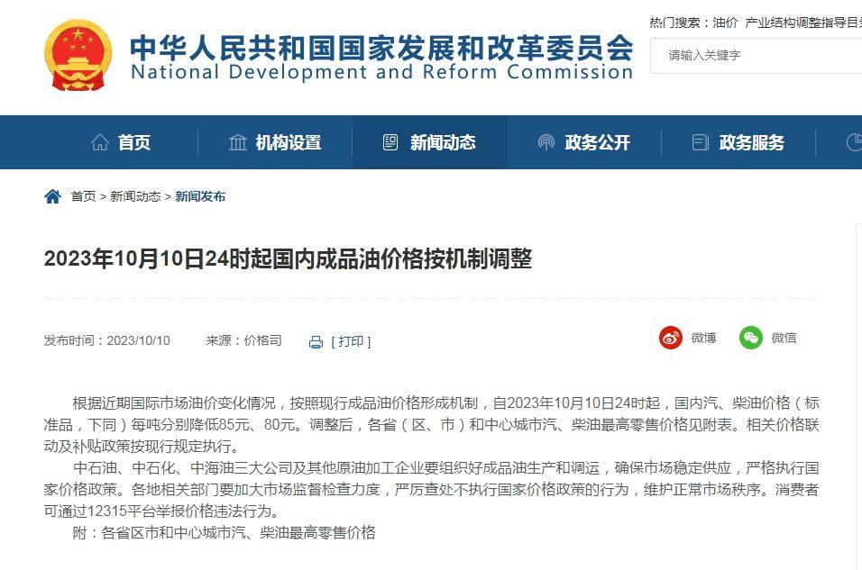 国家发改委表示,根据近期国际市场油价变化情况,按照现行成品油价格形成机制,自2023年10月10日24时起,国内汽、柴油价格(标准品,下同)每吨分别降低85元、80元。
