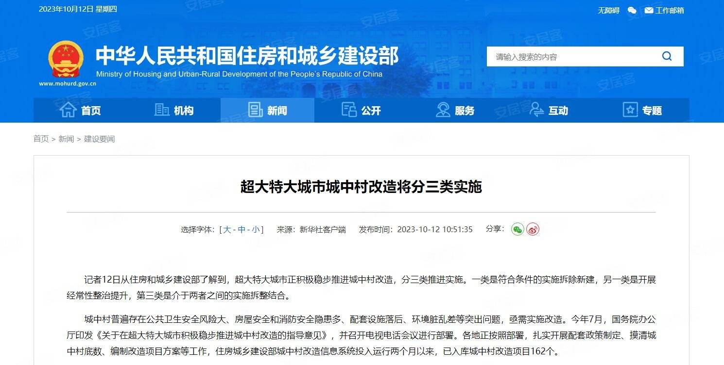 今天,据相关媒体报道,住建部明确,超大特大城市城中村改造将分三类实施: