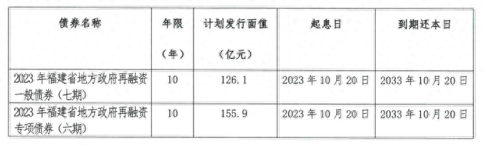 【福建省拟发行282亿元特殊再融资债券 募资用于偿还存量债务】财联社10月12日电,福建省财政厅公告,经福建省人民政府同意,决定公开发行2023年福建省地方政府再融资一般债券(七期)、再融资专项债券(六期),计划发行面值分别为126.1亿元、155.9亿元。招标时间为:2023年10月19日9:30-10:10。再融资债券募集资金投向:发行地方政府再融资债券偿还存量债务。