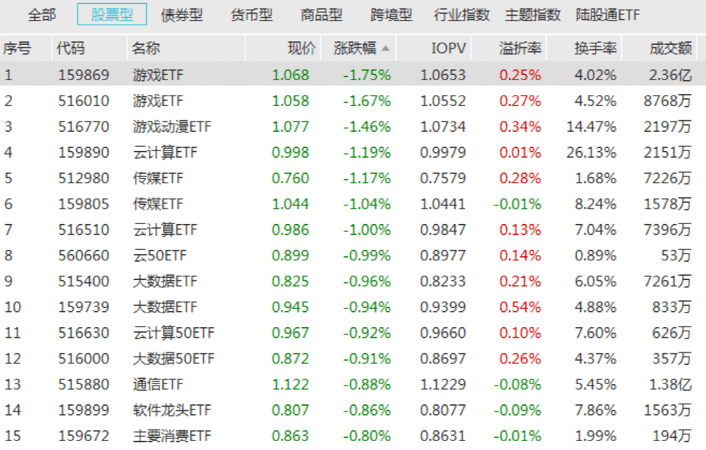 受板块调整影响,游戏、传媒、云计算等多只相关主题ETF跌幅居前。其中,游戏ETF以1.75%的跌幅居于首位。并有云计算ETF、传媒ETF等多只产品跌幅超1%。