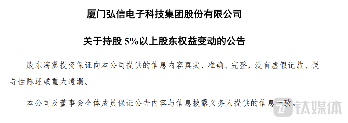 10月11日晚间,弘信电子(300657.SZ)发布关于持股5%以上股东权益变动的公告,称公司股东厦门海翼投资有限公司(下称海翼投资)通过集中竞价交易方式已累计减持公司股份488.41万股,占公司总股本的1%,减持金额9005.84万元。