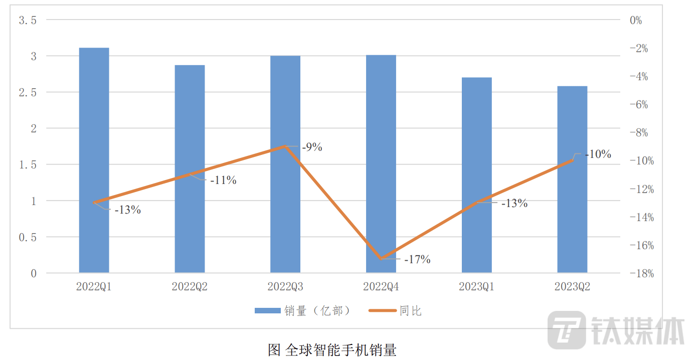 但随着消费电子行业景气度下滑,叠加过去三年居民消费能力下降等因素,消费电子产品如智能手机销量持续下降,进入2023年,智能手机行业继续延续下降态势。据CANALYS的统计数据显示,2023年上半年,智能手机的总体销量约5.28亿部,同比下降12%。