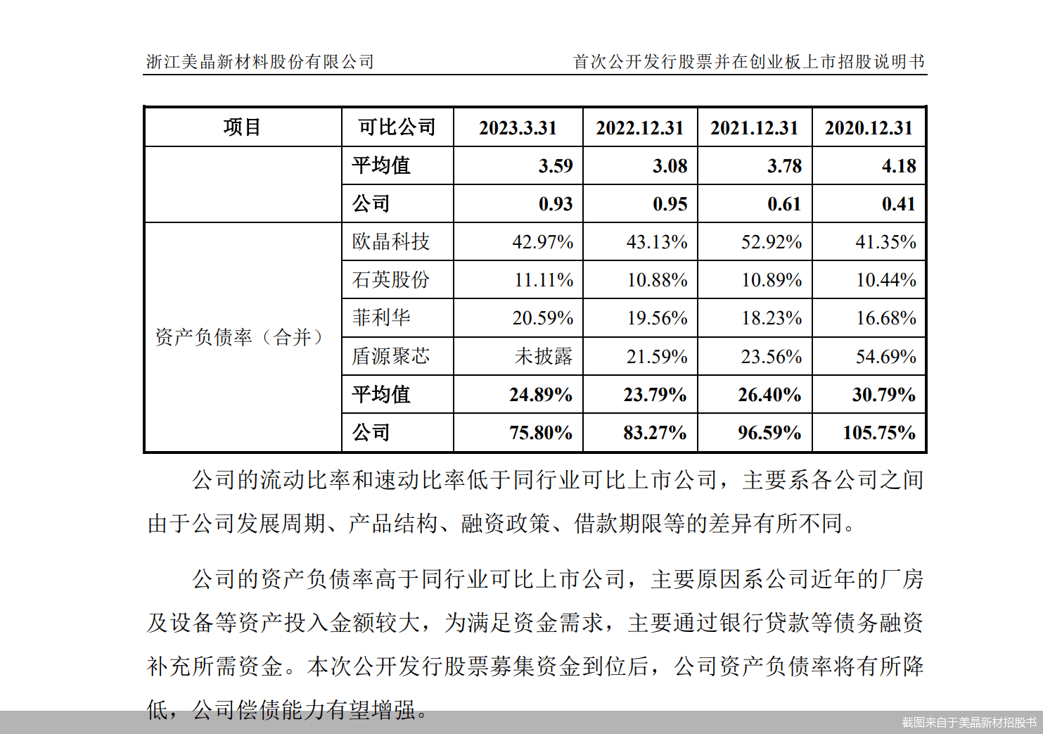 美晶新材表示,公司的资产负债率高于同行业可比公司,主要原因系公司近年的厂房及设备等资产投入金额较大,为满足资金需求,主要通过银行贷款等债务融资补充所需资金。本次公开发行股票募集资金到位后,公司资产负债率将有所降低,公司偿债能力有望增强。
