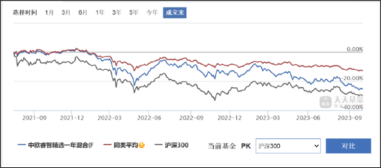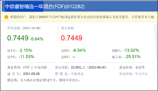 以中欧睿智精选一年持有期混合型基金中基金(FOF)产品为例,该只基金成立于2021年6月,基金经理为桑磊等人,自成立以来收益率为-25.51%。