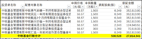 根据公告数据,中欧基金此次获配星辉环材新股50万股,获配金额为2781.43万元。按照最高价与最低价估计,中欧基金参与此次打新星辉环材的基金亏损或在160万至1600万元之间。