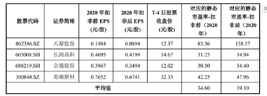 在星辉环材IPO发行时,其发行价为 55.57 元/股,对应的发行人 2020 年扣除非经常性损益前后孰低的归属于母公司股东的净利润摊薄后市盈率为 49.48 倍,高于中证指数有限公司2021 年 12 月 28 日(T-4 日)发布的行业最近一个月静态平均市盈率,超出幅度为 10.47%; 高于主营业务及经营模式与发行人相近的 A 股可比上市公司 2020年扣非后市盈率平均值,超出幅度为 26.55%。