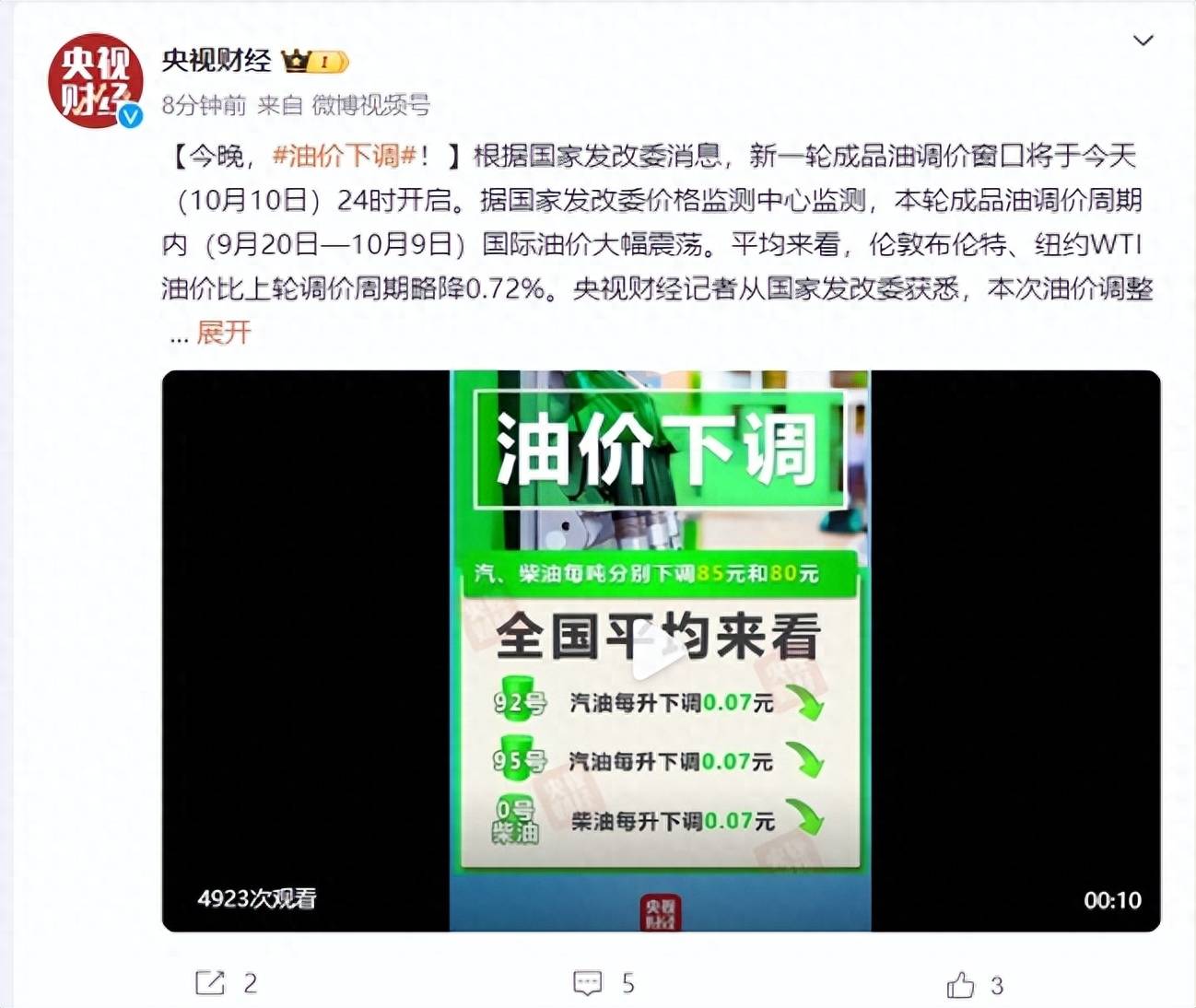 据@央视财经消息,根据国家发改委消息,新一轮成品油调价窗口将于今天(10月10日)24时开启。据国家发改委价格监测中心监测,本轮成品油调价周期内(9月20日—10月9日)国际油价大幅震荡。平均来看,伦敦布伦特、纽约WTI油价比上轮调价周期略降0.72%。