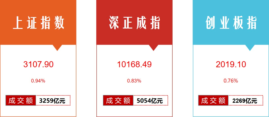 10月12日收盘,三大指数全线飘红,截至收盘,沪指涨0.94%,报3107.9点,深成指涨0.83%,报10168.49点,创业板指涨0.76%,报2019.1点。沪深两市全天成交额8313亿元。个股涨多跌少,3318只个股上涨。