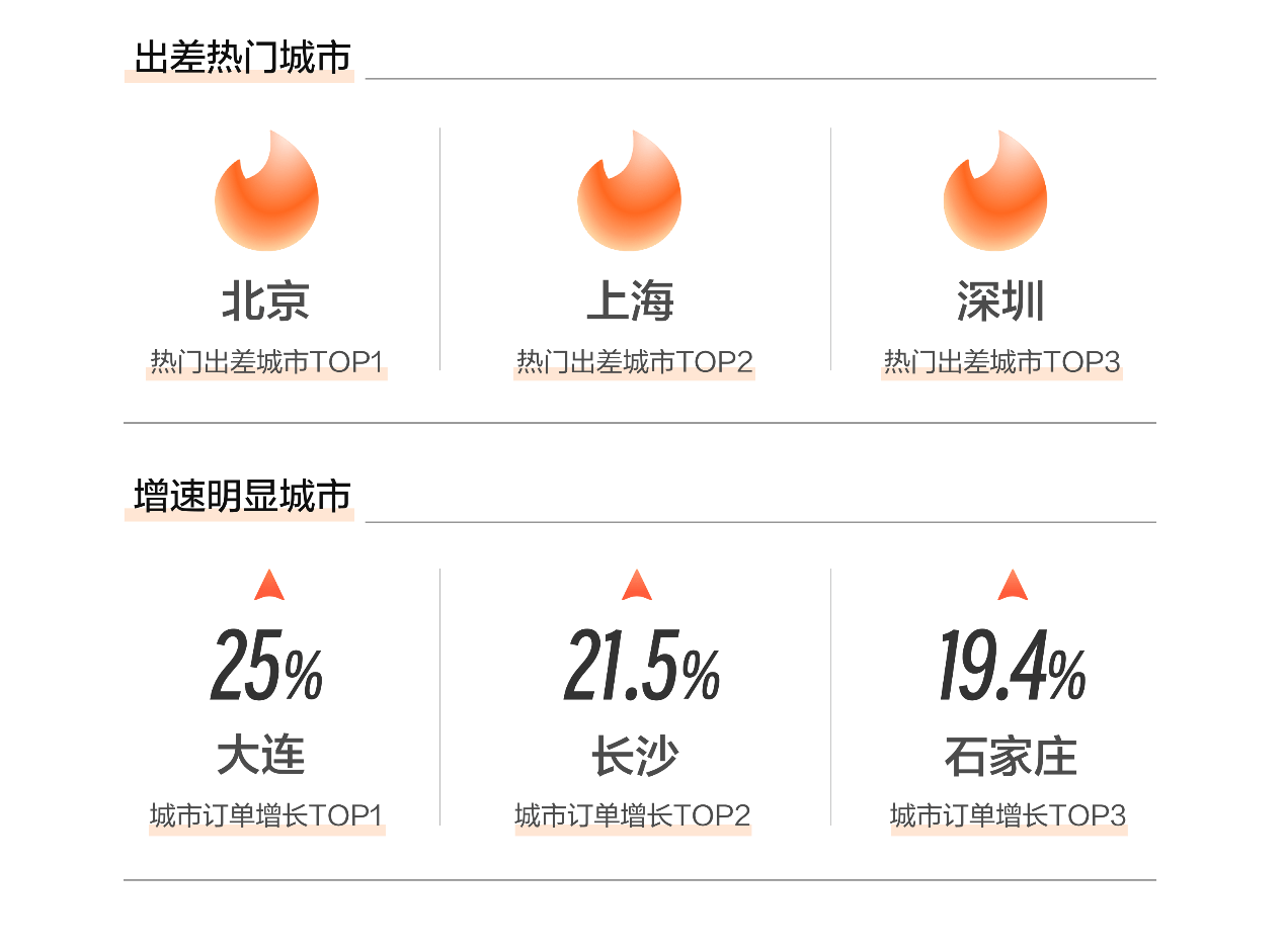 本轮差旅旺季,大连、长沙、石家庄成为差旅热度增长最快的三座城市。