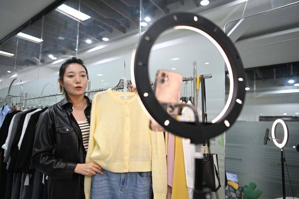 10月8日,石家庄新华区筑盈创业孵化基地一家服饰企业的员工通过直播销售服装。新华社记者朱旭东 摄