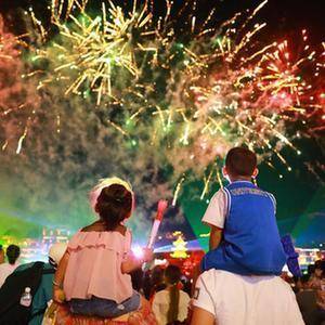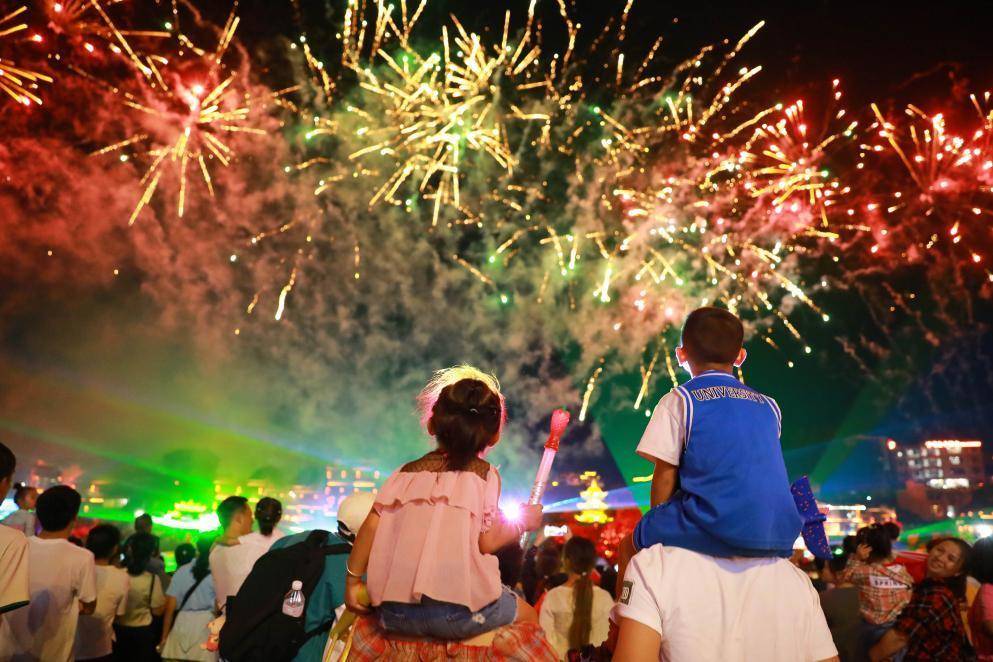 10月1日,游客在贵州省黔东南苗族侗族自治州凯里市下司古镇观赏烟花。新华社发(吴贤燕 摄)