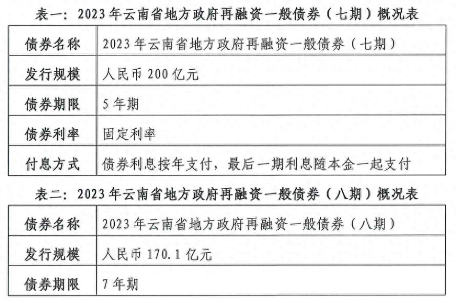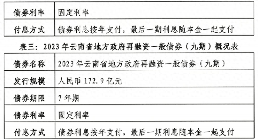 【大河财立方消息】10月12日,据中国债券信息网,2023年云南省地方政府再融资一般债券(七至九期)信息披露,计划发行总额543亿元。其中,5年期200亿元、7年期343亿元,品种均为记账式固定利率附息债。债券利息按年支付,债券到期后一次性偿还本金。募集资金拟用于偿还存量债务。