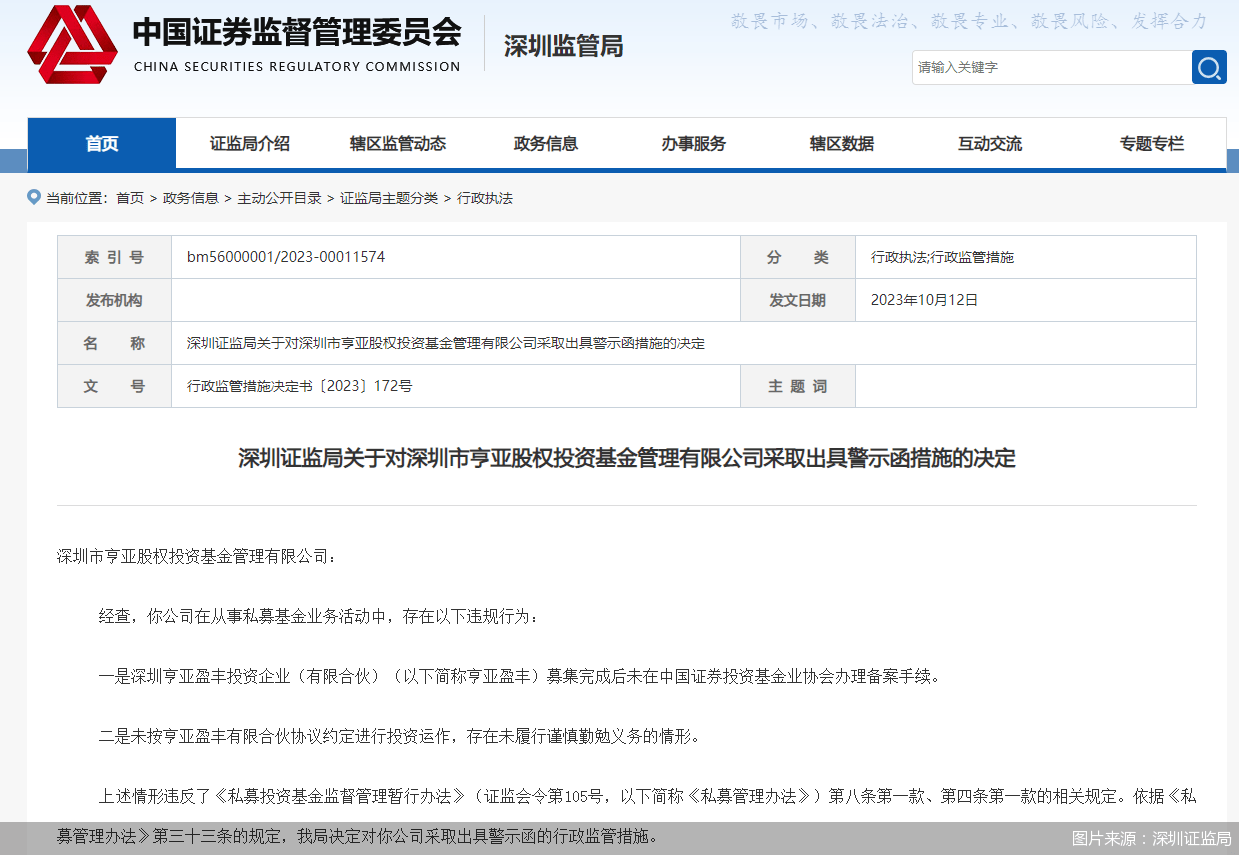 北京商报讯(记者 李海媛)10月12日,深圳证监局发布公告称,经查,发现深圳市亨亚股权投资基金管理有限公司(以下简称“亨亚股权”)在从事私募基金业务活动中,存在深圳亨亚盈丰投资企业(有限合伙)(以下简称“亨亚盈丰”)募集完成后未在中国证券投资基金业协会办理备案手续;未按亨亚盈丰有限合伙协议约定进行投资运作,存在未履行谨慎勤勉义务的情形。