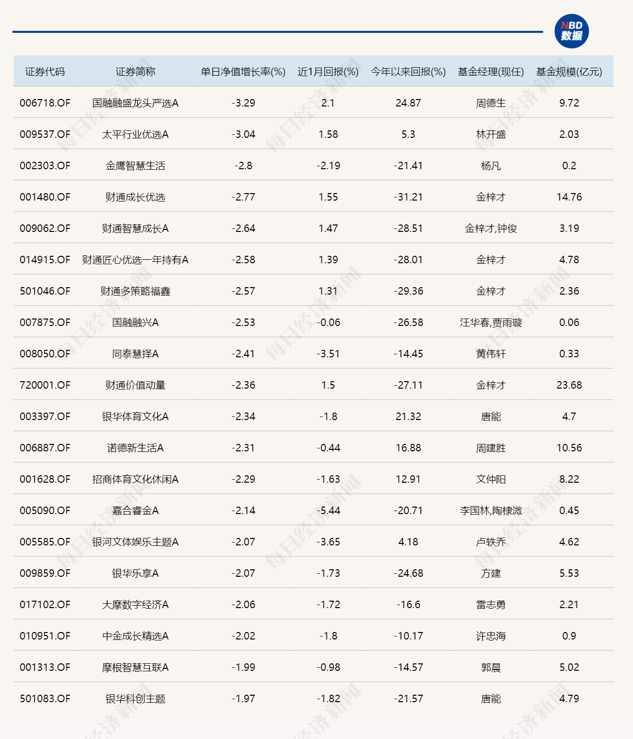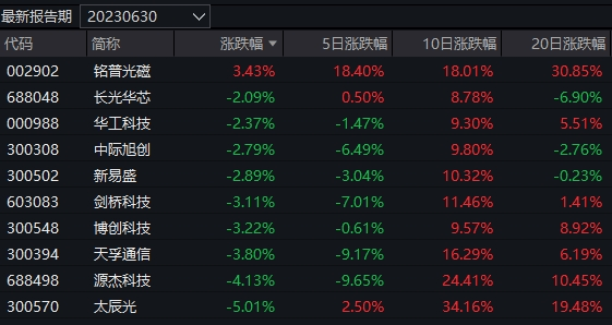 跌幅榜方面中,国融融盛龙头严选A以3.29%的跌幅垫底,其次是太平行业优选A和金鹰智慧生活,分别下跌3.04%和2.80%。国融融盛龙头严选A的重仓股主要集中在光通信(CPO)领域,如新易盛、中际旭创、源杰科技等。