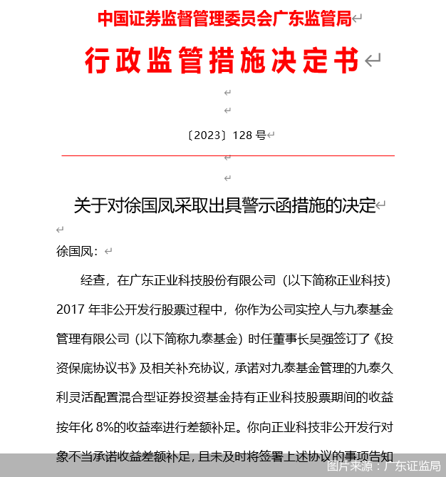 继今年2月九泰基金因定增投资“老鼠仓”事件遭罚后,又有相关机构人员遭监管处罚。10月12日,广东证监局针对广东正业科技股份有限公司(以下简称“正业科技”)实控人徐国凤在2017年与九泰基金时任董事长吴强签订《投资保底协议书》及相关补充协议相关行为,对徐国凤出具警示函。