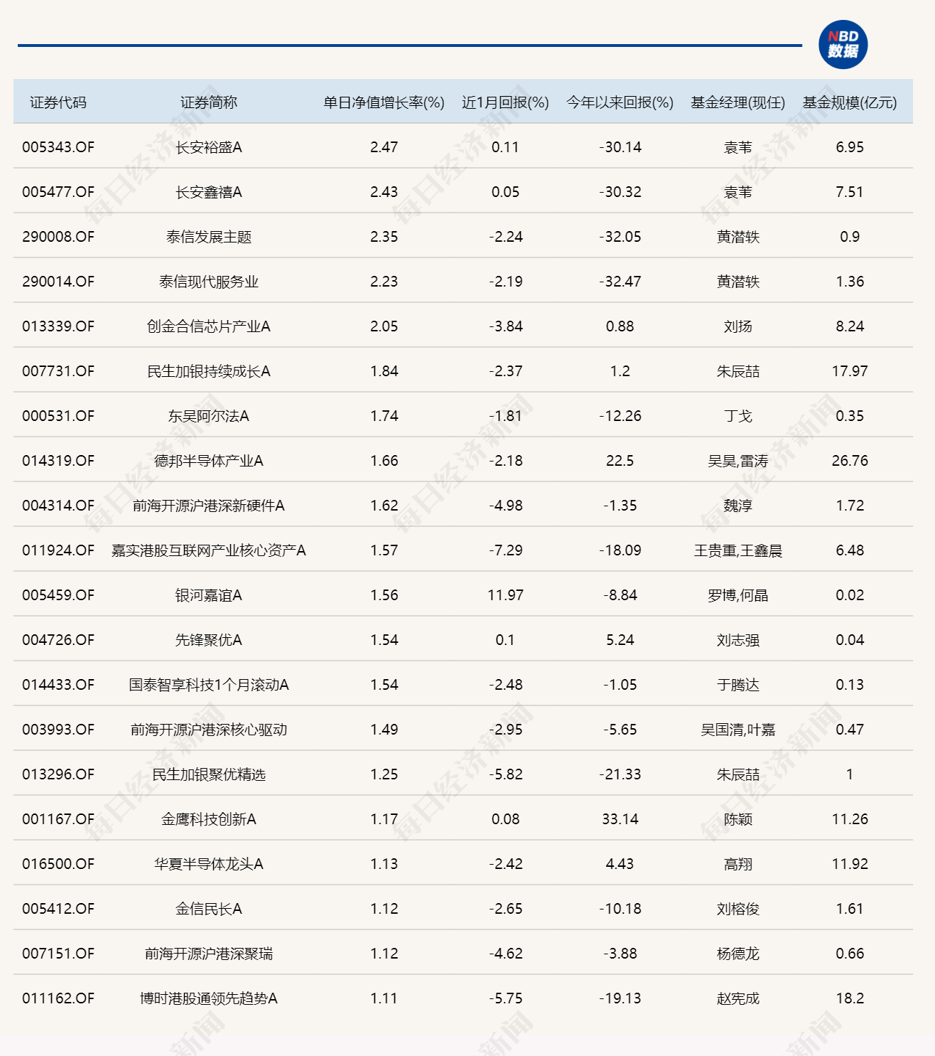 涨幅榜上,长安裕盛A和长安鑫禧A分列前两位,分别上涨2.47%和2.43%,均由袁苇基金经理管理。泰信发展主题和泰信现代服务业紧随其后,分别上涨2.35%和2.23%,均由黄潜轶基金经理管理。